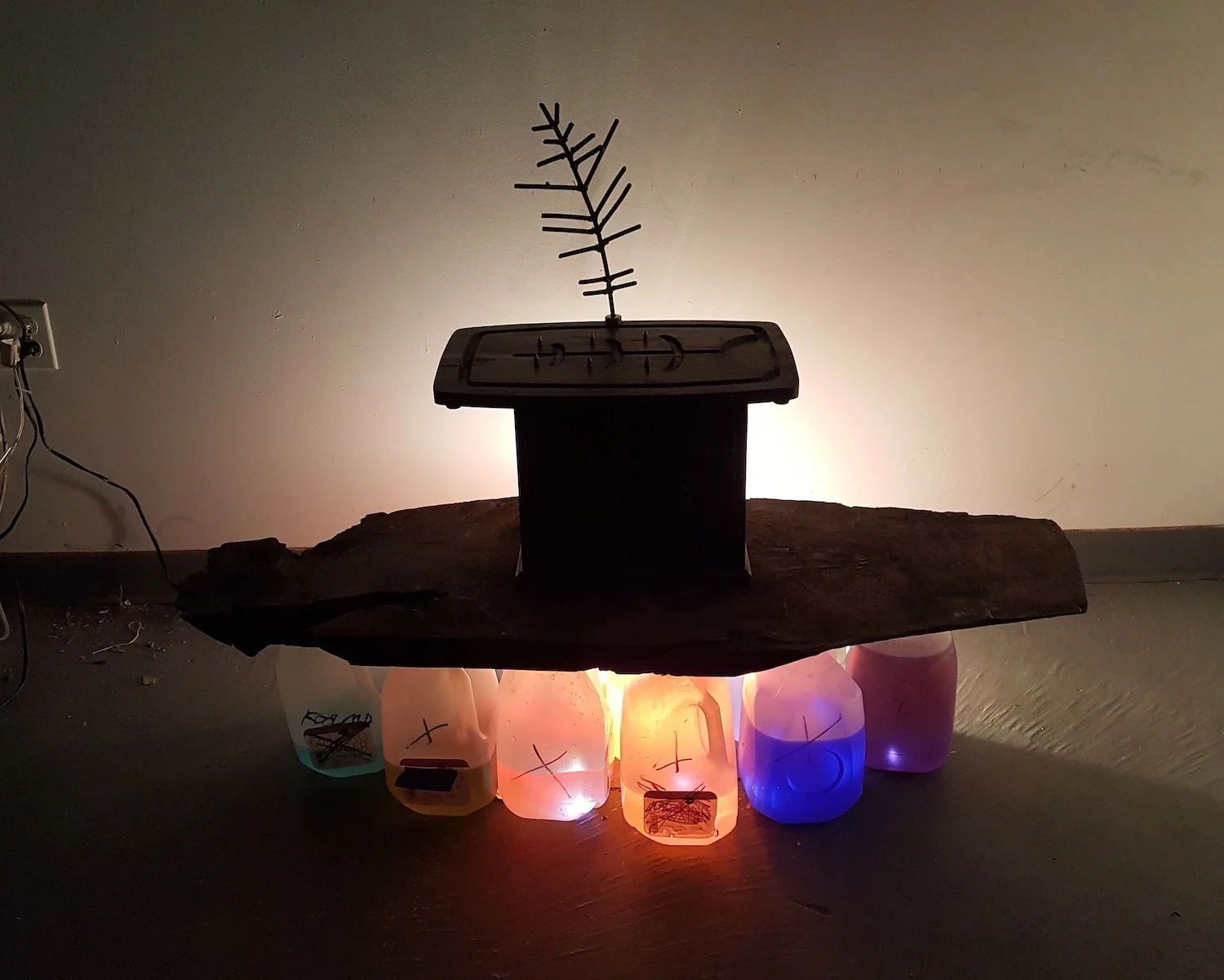 2019. A Ceremonial Work Station. Wood, Clay, Carving Board, Metal, Plastic Jugs, Mysterious Liquid